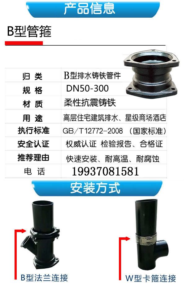 離心機(jī)制抗震柔性鑄鐵排水管件B型管箍套袖,柔性抗震鑄鐵,快速安裝,耐高溫,耐腐蝕;用于高層住宅建筑排水、星際商場(chǎng)酒店。