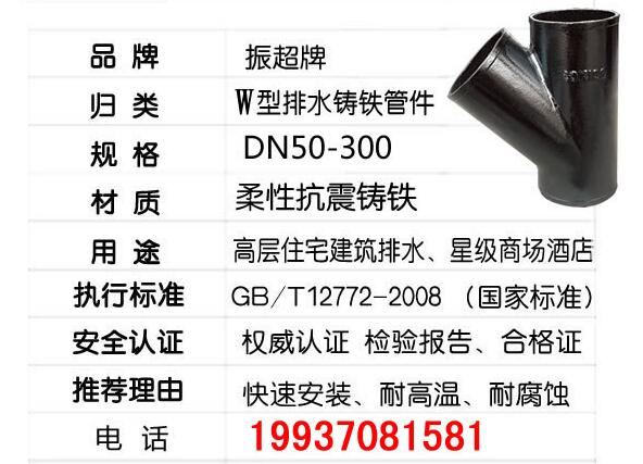 振超牌W型鑄鐵排水管件,柔性抗震鑄鐵,快速安裝,耐高溫,耐腐蝕;用于高層住宅建筑排水、星際商場酒店。