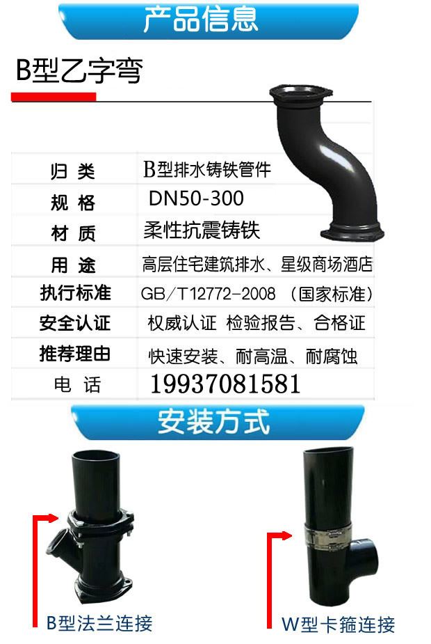 柔性鑄鐵排水管件B型乙字彎廠家,柔性抗震鑄鐵,快速安裝,耐高溫,耐腐蝕;用于高層住宅建筑排水、星際商場(chǎng)酒店。
