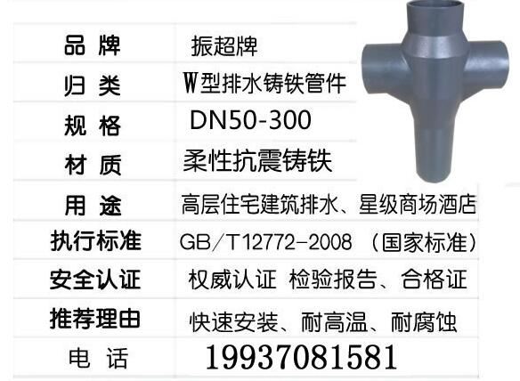 振超牌W型鑄鐵排水管件,柔性抗震鑄鐵,快速安裝,耐高溫,耐腐蝕;用于高層住宅建筑排水、星際商場酒店。