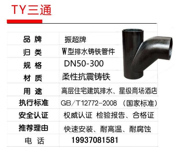 振超牌W型鑄鐵排水管件,柔性抗震鑄鐵,快速安裝,耐高溫,耐腐蝕;用于高層住宅建筑排水、星際商場酒店。